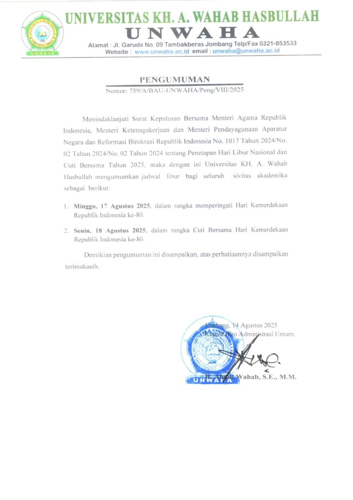 Jombang – Universitas KH. A. Wahab Hasbullah (UNWAHA) resmi mengumumkan jadwal libur bagi seluruh sivitas akademika dalam rangka memperingati Hari Ulang Tahun ke-80 Kemerdekaan Republik Indonesia. Pengumuman ini disampaikan melalui Surat Nomor 759/A/BAU-UNWAHA/Peng/VIII/2025 yang diterbitkan pada 14 Agustus 2025 oleh Biro Administrasi Umum UNWAHA.