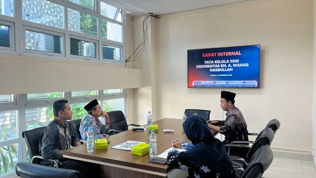 Universitas KH. A. Wahab Hasbullah (UNWAHA) Jombang menyelenggarakan Rapat Internal Tata Kelola Sumber Daya Manusia (SDM) sebagai upaya penguatan manajemen kepegawaian dan peningkatan disiplin kinerja dosen serta pimpinan. Rapat ini dilaksanakan di Ruang Rapat Wakil Rektor (WR) pada Selasa, 23 Desember 2025.